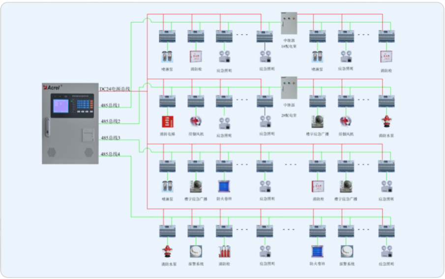 系統(tǒng)組網(wǎng)共分為站控管理層、網(wǎng)絡(luò)通訊層、現(xiàn)場(chǎng)設(shè)備層三層,該項(xiàng)目通訊總線共接入9條通訊總線,總線在樓層配電箱手拉手串接后,接入消防設(shè)備電源中繼器,在接入壁掛式后臺(tái),組成消防設(shè)備電源監(jiān)控系統(tǒng)的大動(dòng)脈。AFPM100消防設(shè)備電源監(jiān)控系統(tǒng)能夠?qū)ο涝O(shè)備的電源進(jìn)行實(shí)時(shí)的監(jiān)控,通過(guò)檢測(cè)消防設(shè)備電源的電壓、電流、開(kāi)關(guān)狀態(tài)等相關(guān)信息,從而判斷消防設(shè)備電源是否有斷路、短路、過(guò)壓、欠壓、缺相、錯(cuò)相以及過(guò)流(過(guò)載)等故障信息并報(bào)警、記錄。通過(guò)友好的人機(jī)交互界面,實(shí)時(shí)反映出被監(jiān)控設(shè)備電源的狀況,并集中顯示,從而有效避免在火災(zāi)發(fā)生時(shí)消防設(shè)備由于電源故障而無(wú)法正常工作的危急情況,保障消防聯(lián)動(dòng)系統(tǒng)的可靠性。該項(xiàng)目現(xiàn)場(chǎng)共有152只AFPM3-2AV消防設(shè)備電源探測(cè)器模塊。