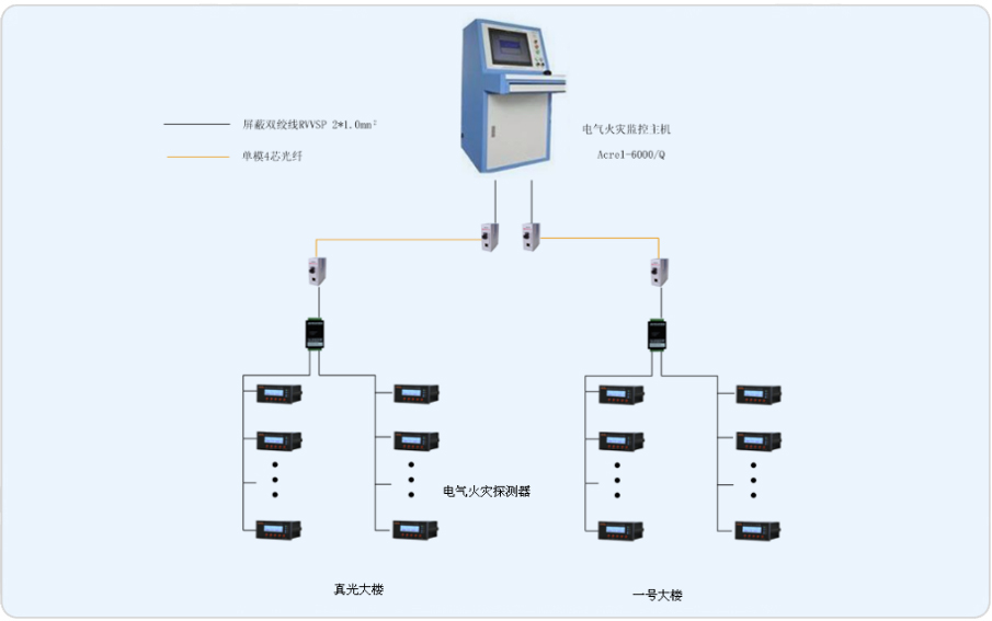 本期工程的監(jiān)控范圍主要為真光廣學(xué)大樓及新建一號(hào)樓,新建一號(hào)樓47個(gè)漏電流監(jiān)控裝置分布在B1~8F中,真光大樓33個(gè)漏電流監(jiān)控裝置分布在B1F~9F中,現(xiàn)為本項(xiàng)目設(shè)計(jì)一套Acrel-6000電氣火災(zāi)監(jiān)控系統(tǒng),監(jiān)控裝置通過(guò)集線(xiàn)器及光纖至電氣火災(zāi)監(jiān)控裝置,并由此來(lái)實(shí)時(shí)監(jiān)測(cè)商業(yè)樓內(nèi)重要回路的漏電流,以確保商業(yè)區(qū)配電系統(tǒng)的電氣安全。